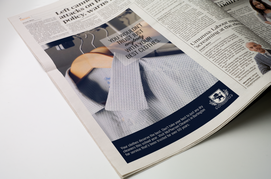 McPherson Cleaners “That Chair” Campaign – visually cohesive campaign across print and digital platforms.